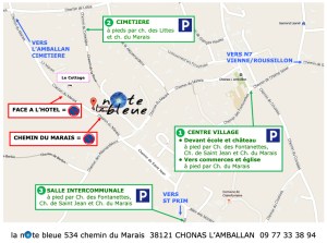 – se garer prioritairement 1) au centre du village 2) rue du Cimetière 3) sur le parking de la salle intercommunale (voir plan ci-dessous). Les personnes chargées ou ayant des difficultés à marcher peuvent se garer momentanément le long du mur de soutènement (4 voitures maximum en dessous du 534 ch du Marais). – marcher quelques minutes à pied