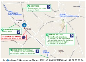 – se garer prioritairement 1) au centre du village 2) rue du Cimetière 3) sur le parking de la salle intercommunale (voir plan ci-dessous) et marcher quelques minutes à pied.